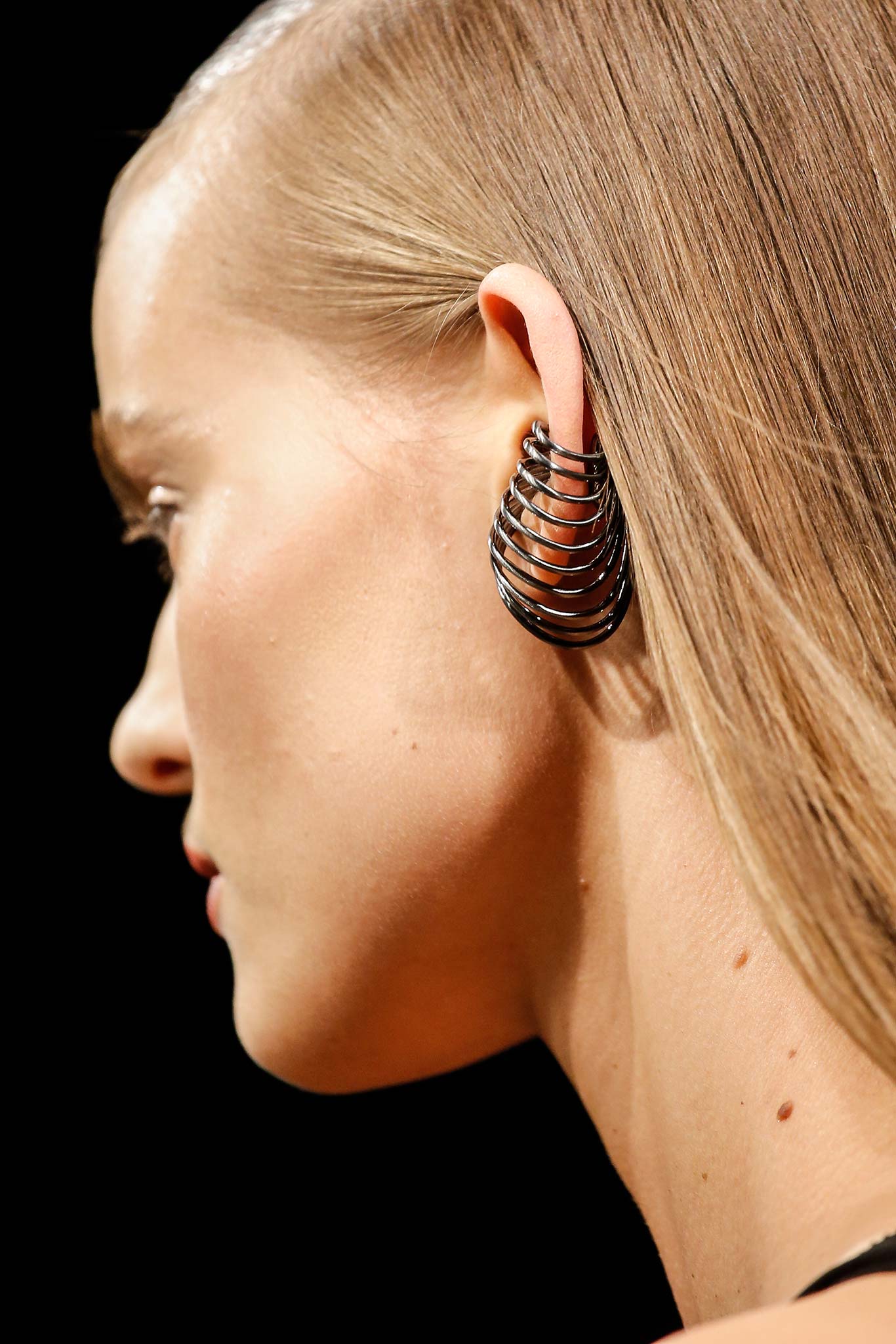 Donna Karen kept her entire collection simple and streamlined. A perfect illustration of this was the unique metal ear cuffs that appeared cage like, wrapping and spiraling in perfect hanging formation around the lobe of the ear. The statement ear pieces are a collaboration with jewelry designer Lynn Ban.