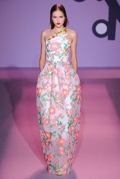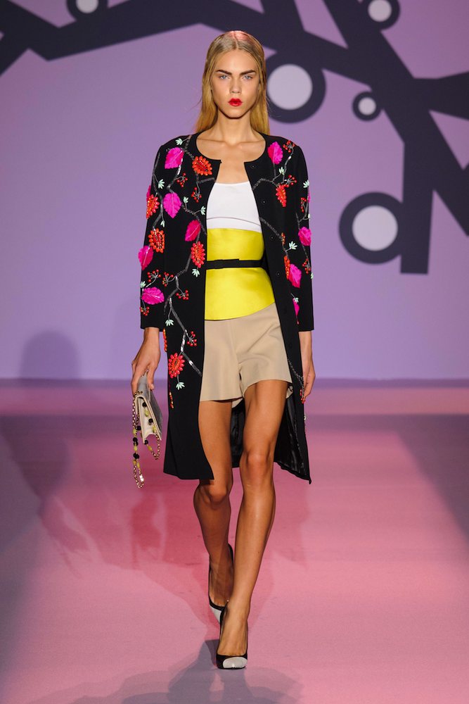 The show had an eclectic formulation of contrasting elements. Rich, vibrant colour blocking sat in stark contrast to blended pastel hues; sharp angular shapes appeared next to soft florals; and structured ensembles played against the occasional loose fitting garment. Texture was manipulated throughout the show with designs hosting decadent embroidery, high shine fabrics, dreamy silks and sheer paneling.