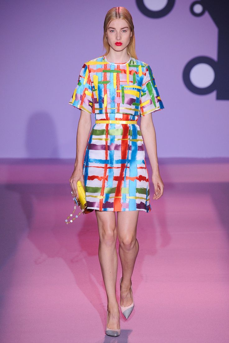Presented on a backdrop reminiscent of the 1960s, box shaped dresses, mini skirts, mismatched patterns and geometric shapes were clear nods to the era but Andrew rebelled against past restrictive feminine ideals and used his touch to punctuate these ladylike vibes with a modern edginess.