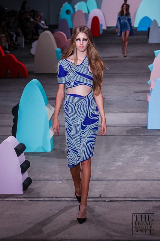 A variety of striking silhouettes from sculptured chic tailoring, voluminous ruffles and synched high-waists, merged 90’s minimalism with Alice McCall’s signature of pop femininity. Draped memory fabrics, engineered art placements on contrasting body contouring and viscose lurex knits took on a higher power and added a rich allure to an already daring presentation.